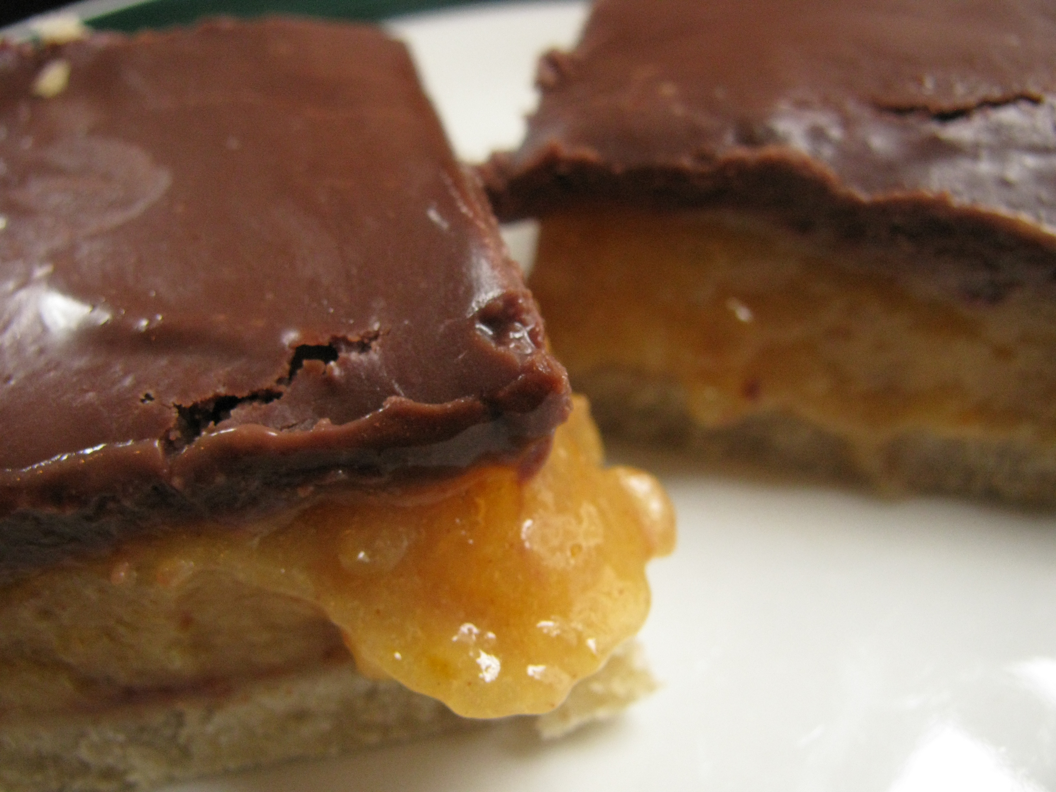 I did her non-recipe justice by paying very little attention to any part of it, except the concept– bittersweet whole orange puree (I just used marmalade whizzed up in the food processor), thickened with egg, on a pastry crust, with chocolate on top. I made mine bars, cuz I don’t have even a pie dish here, let alone a tart dish. They are intriguing little numbers. Exotic. I added cinnamon to play up the Moroccan flavor, and vanilla. I wouldn’t say they’re my new fave, the bitterness of the marmalade is kind of overpowering in such quantity, but well worth making.