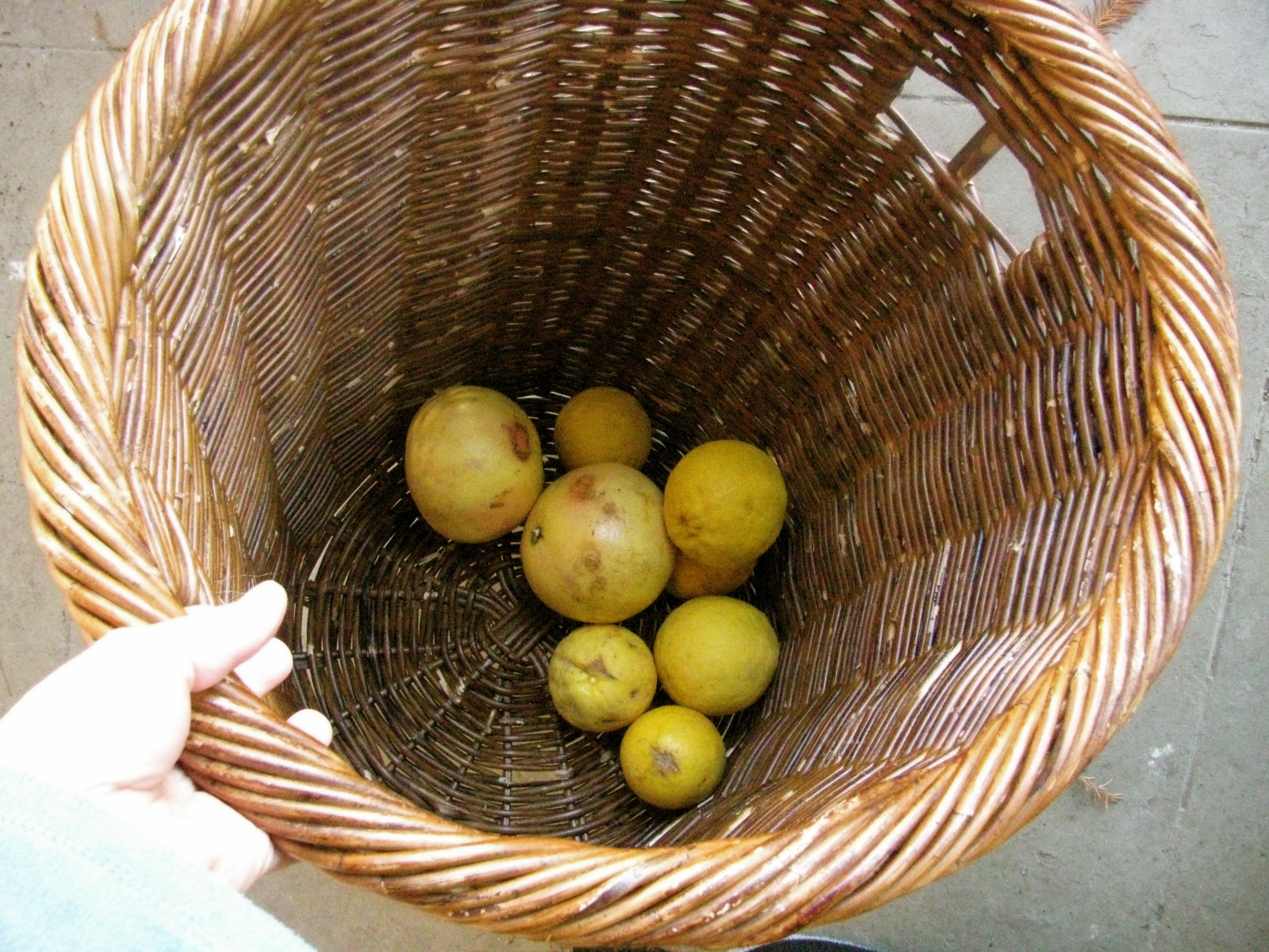 There were several fruits on the sidewalk beneath the overhanging branch. A few had split in the fall, and were buzzing with fruit flies, but three were whole and good. As I bent over to pick them up, I saw under the tree’s branches into the yard of it’s owner. Of course, a dozen more grapefruits under the tree on the other side of the fence. But also– a lemon tree. A banana tree. And a pitchfork stuck in the ground. I need to meet these people!