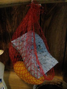 that’s rarely dealt with, that really gets my goat. Soggy sponges and rags. This is not just a matter of asthetics. Those suckers breed nasties like crazy. I think it’s funny (as in ironic, not haha) when I go into someone’s kitchen and they have antibacterial dish soap and a host of toxic cleaners, and their sponge is sitting in a puddle of old dish water in the bottom of the sink. When your sponge smells gross, it’s because it is gross. Sponges are pretty much asking for it. A dishrag is a much better solution, they’re thin, they dry fast, you can throw it in the wash once a week, and they last more or less forever. Unfortunately I’ve just never been able to come around to washing dishes with a dishrag. A sponge feels right– it’s the right size, the right thickness, it’s got the scratchy stuff on one side. But to keep a sponge from going nasty, you have to rinse it well and give it a chance to dry between uses. I used to have a little slatted soap dish/stand. That worked good and was pretty. Haven’t found anything like it here, so I improvised with this old onion bag.