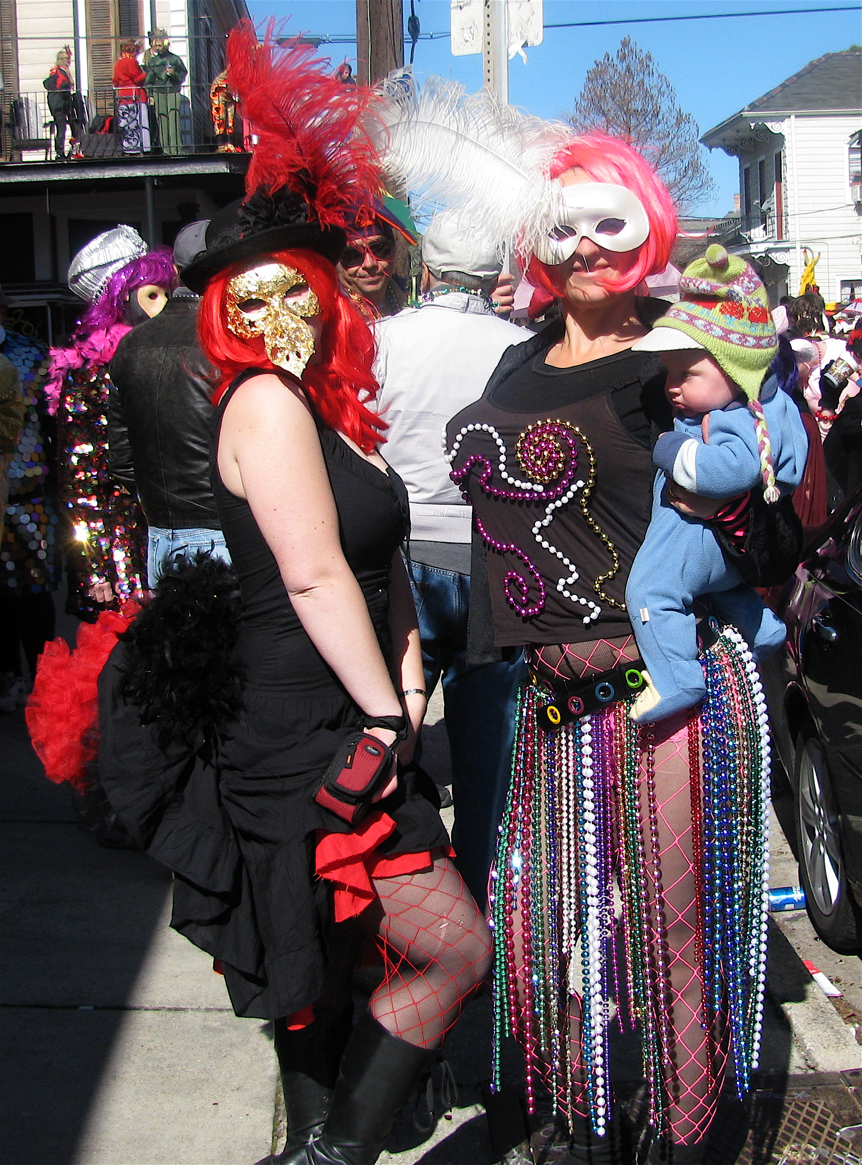 After two weeks of trying to rally myself to get into the parade spirit, Fat Tuesday finally came. The day there was supposedly a big party of costumed revellers downtown. My sis and I are heavy into costuming, so we were really looking forward to this, had spent days getting our outfits together and making fabulous masks. I had heard about a parade from the Marigny to the French Quarter, called the Saint Anne’s Parade. A walking parade of anyone and everyone in costume. We wanted desperately to make this parade, thinking it might be our only chance to see awesome costumes. Unfortunately, we couldn’t find any info online, in the paper, or anywhere else about where and when it was. Some kind of underground parade. Oooo la la, how alluring. We heard a rumor it was at 9 AM (the partying starts early on Mardi Gras day, strange, we thought) so we hauled our asses out of bed at 6 AM to get in costume and out the door by 8 AM, determined not to miss it.