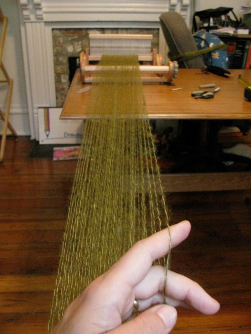 …But if I did have any more time, I’d weave a little. Because yes, I did finally re-warp my loom last week, after yet another ripping out of a project that wasn’t working and I swear I will not try to use a shaggy warp again! Really, I promise. Okay, fine. Actually, I restrung it with a shaggy warp. But! I’m following a pattern this time. The warp is shaggy and sticky, but skinny and far spaced. And the weave is super loose. It’s meant to look lacey. The yarn is one of those super divine luxury yarns, mohair and silk, expensive, but at such a light weave, not bad for the overall project.