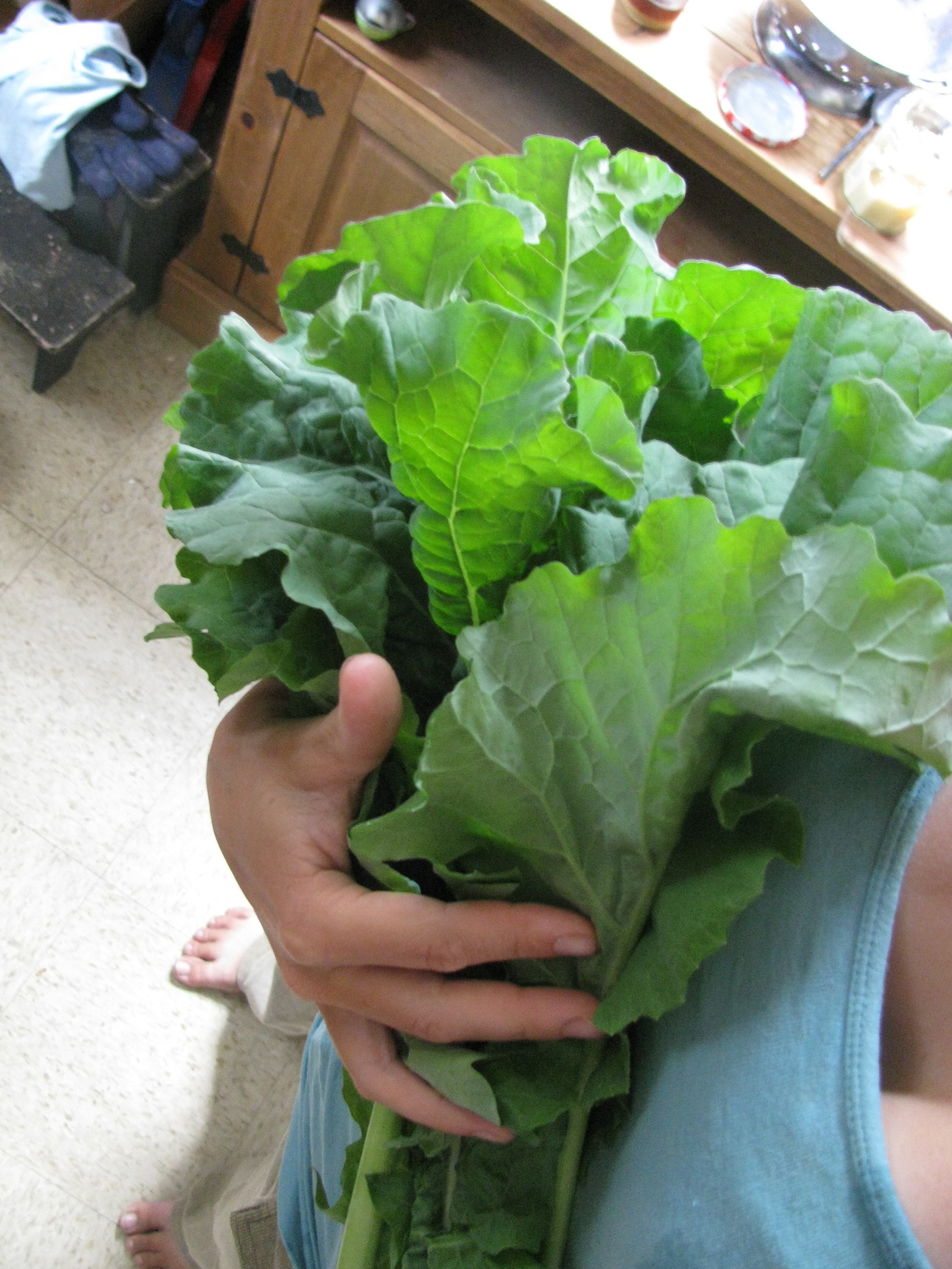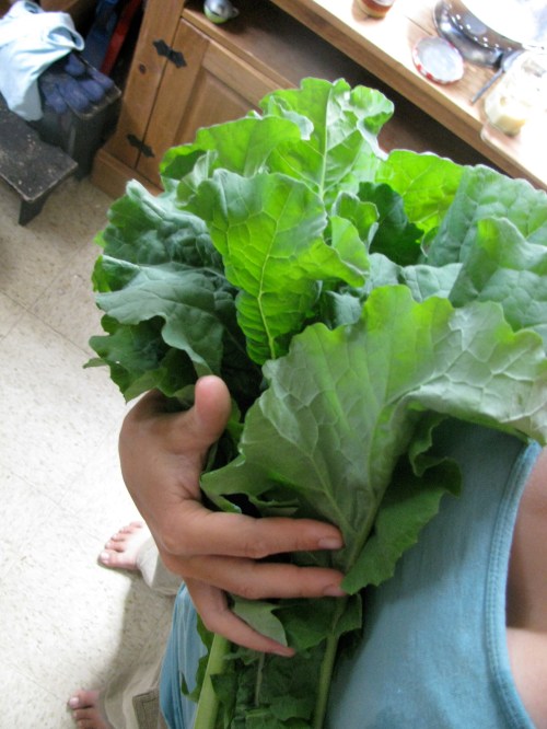 I am just immeasurably happy to be eating fresh grown greens. And having such a glut that I’m sharing them with a neighbor. After I gave her the first batch, and instructed her how to cook them (saute an onion till golden in plenty of butter, throw in way more coarsely chopped greens than you think you need, along with a tiny drizzle of water, cover and cook till vivid green and tender. Add chopped tomatoes instead of the water if you’re feeling Southern) She was so effusive I couldn’t help but keep supplying her. It’s fun to convert someone to homegrown greens.