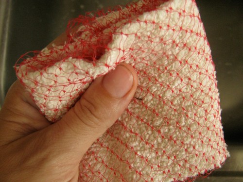 Oh, speaking of improvements. Normally I would be grossed out by tepid soap-less washing partly because I have this feeling like sponges are nasty, and make things dirtier, and I kind of hate rubbing them all over my dishes. But I’d never found a reasonable substitute (except dirt, but that’s another story). Wash cloths are too big and floppy-all-over-the-placey, and don’t have any bite.