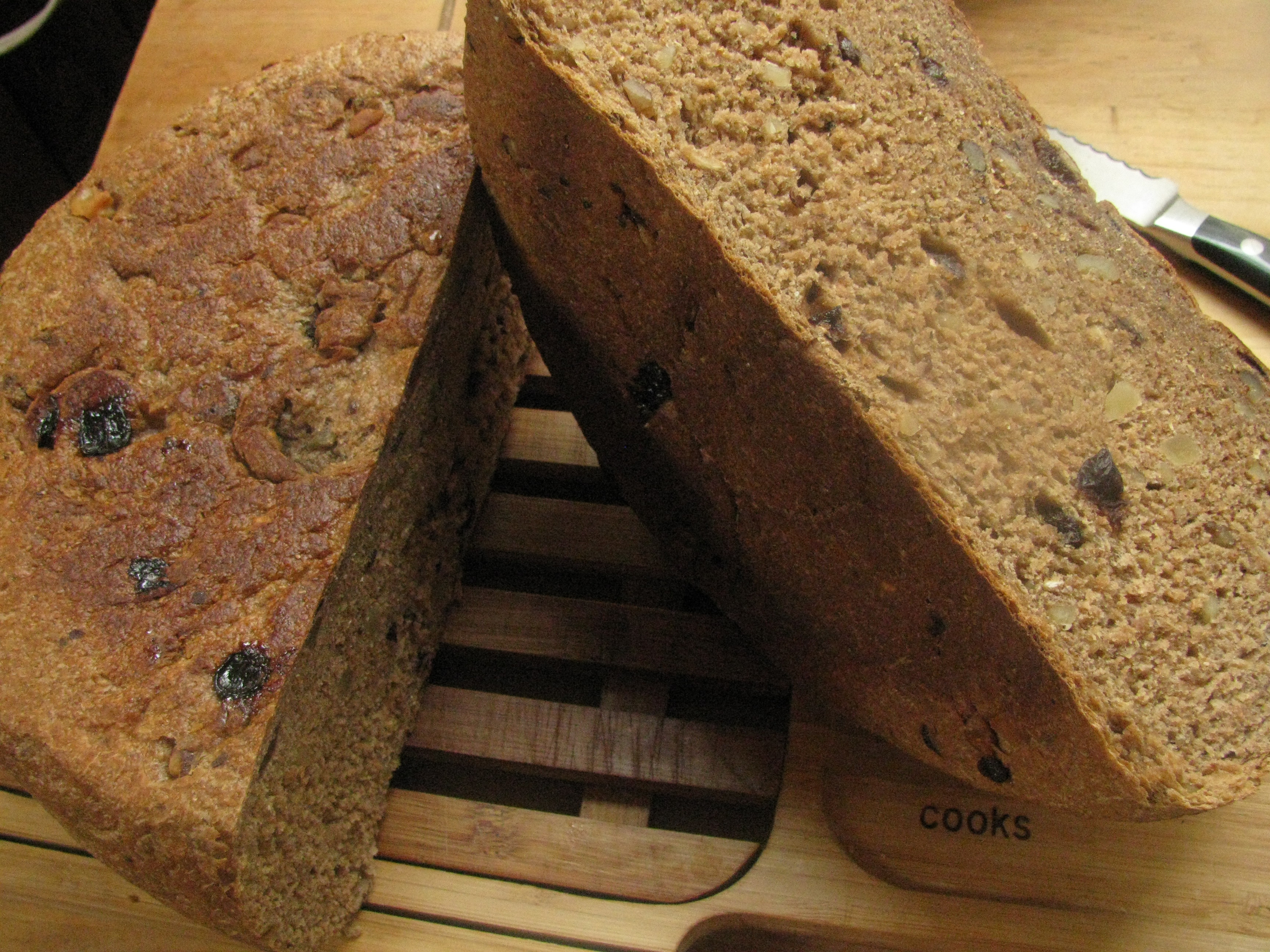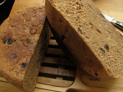 So I started adding in extra raisins and nuts to make a delicious morning bread, perfect for those of us who can’t handle granola for breakfast (which is to say– me. Ironic isn’t it that the granola maker doesn’t eat it? Don’t know why, I wish I could feel good eating granola in the morning. It’s so quick and easy, and I never feel like cooking. But it makes my tummy feel bad. Partly the milk and partly the undercooked grains I think.)