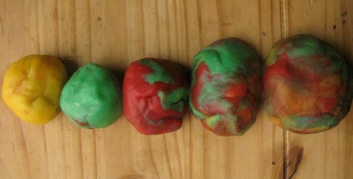 Divide into three or four pieces and knead in the colors, either by hand or with your mixer. I let the Toddler squeeze in the colors, which meant that looking away for a second resulted in an ever so indulgent red.