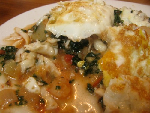 this potato, chard and tomato casserole got topped with fried eggs and called "hash"