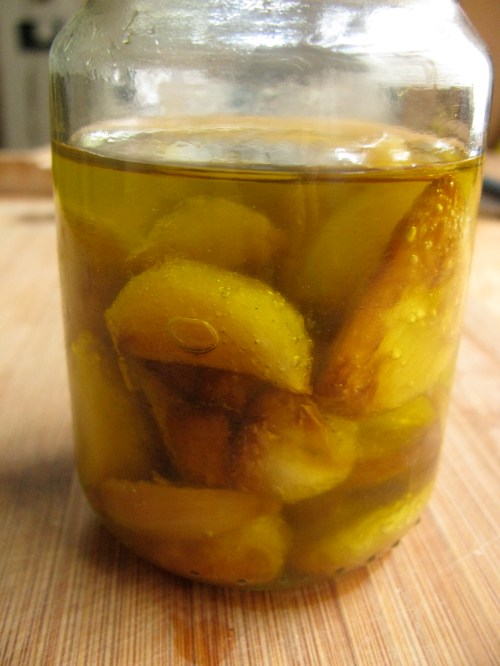Roasted Garlic. Just did this tonight, and worked a treat. I peeled 3 heads of garlic (whew!) and put the cloves in Trix, with several tablespoons of olive oil. I started it out at ‘brown’ and once the cloves had toasty deep golden color, I turned it to slow cook for an hour. Soft, buttery garlic caramel nuggets. Yum!