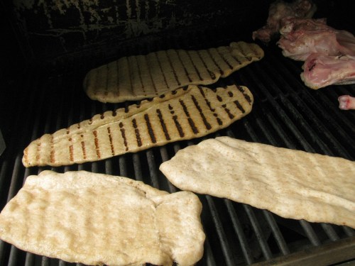 So. That is how I determined to fire up the grill. Then (and here’s what always happens with me, that I can not necessarily recommend, particularly to mothers of two) I thought ‘weeeell, if I’m gonna grill… I might as well grill the shrimp, that would be delicious. And heck, if I grill the chicken, it will be all cooked and ready to throw into whatever later in the week.’ And, oh yeah, I recently discovered baking flatbread on the grill. I’ve never read anything about this, but surely others have figured it out because it is absolutely brilliant. I love flatbreads. Not the cardboard pita from the grocery store, have mercy! But good fresh, chewy flatbreads, like you get at Lebanese restaurants. I have a wonderful recipe I got ages ago while traveling. But you have to bake them at 500 degrees, and even when I live in a cold place it’s hard to justify all that heat.