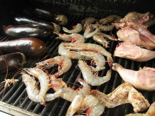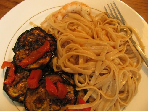 Now you’re wondering how and what exactly we are going to eat for dinner, because isn’t it about that time by now? Well, with all my projects going on, I wasn’t about to do anything else complicated. I knew I wanted to eat those shrimp, so I boiled some pasta in Trixie, then I just tossed it with garlic and shrimp. A quick dressing for the grilled eggplant slices, and at the last minute while I am trying to rally the family to the table, I am peeling the red pepper to go with the eggplant salad. Chop, chop, stir, stir.