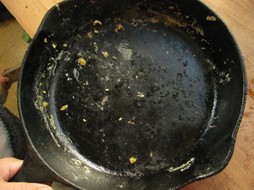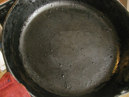 The key amongst all of this is to pay attention to your pan. Consider it a low maintenence pet, akin to maybe a goldfish. You can ignore it most of the time, but once in a while you do actually have to feed the bugger. In the case of cast iron, this means reseasoning. The oven season that I described in the first post is great for popping yer pan’s cherry on, but for regular upkeep a stovetop quickie is perfectly effective.