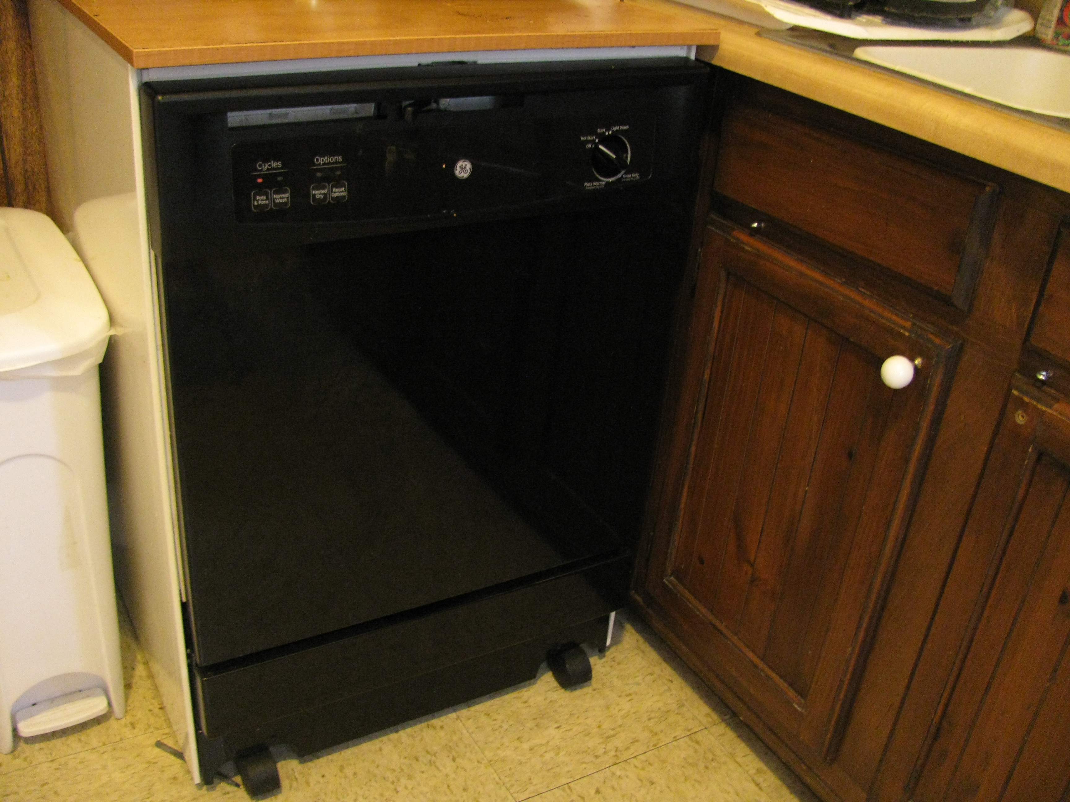 So for my birthday last year she bought me a free-standing dishwasher. It’s not plumbed in, instead it has a long hose that attaches to your sink faucet (don’t feel bad, I didn’t know either). This is a great thing if, like us, you are in a rental. And it was only $200. Of course, it’s just a standard, bottom of the line dishwasher, nothing fancy, and not particularly efficient I’d guess.