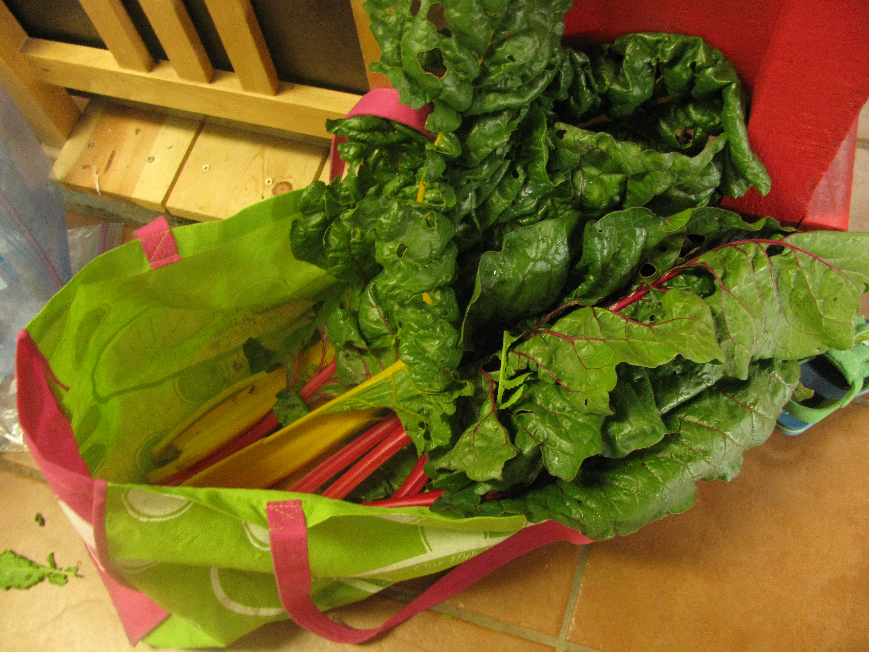 We had breakfast with a friend (thank you!) and then rode over to the community garden to water. It’s officially summer here. Hot. Time to water every other day. And the harvests are rolling in. More chard. Even with the trickiest muffin recipe ever, I still didn’t manage to use up all the stalks from the last bunch. Into the compost. Enter the new beauties.