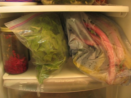 I had to clean out my fridge to accommodate the new batch of garden lovelies. Time to get cookin! I made stir fried rice with carrots, garlic greens and chard stems for dinner. (That’s some beet and cabbage sauerkraut on the left there from last month’s big cabbage harvest. Gotta love that color, right?)