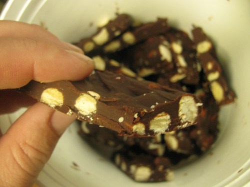 Fortunately, I made up a batch of mama treats last week. It’s good to have a few tricks up your sleeve. This easier-than-pie recipe stretches that expensive fair trade chocolate nicely. And doesn’t require a hot oven.