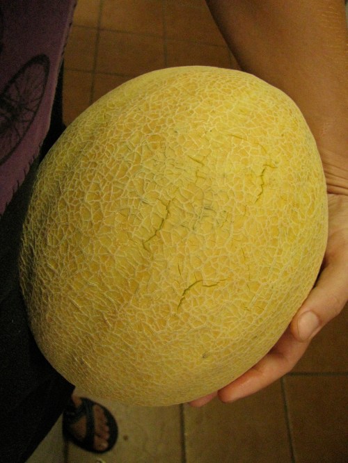 I put the enormous melon into my bag with some little eggplants and yet another load of red marconi peppers. I hurried home. I ran inside for a knife. I drooled in anticipation.
