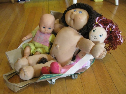 Or, this morning, “Mama, my baby dolls are sick. They need one of those things that people ride in when they’re sick.”
