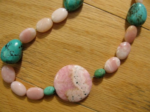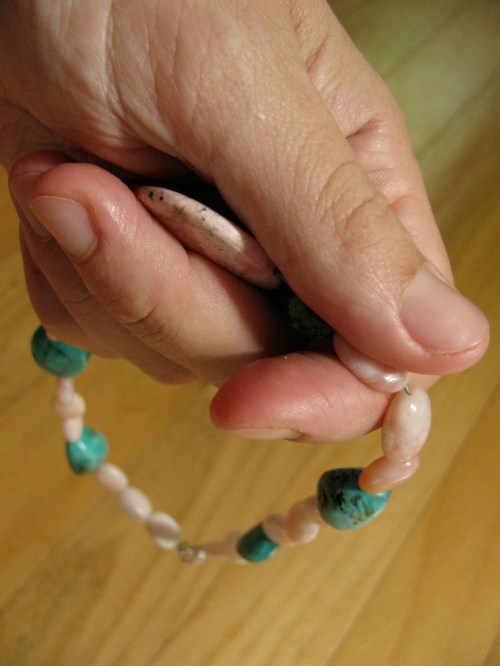 I really liked the idea of beads, a physical grounding element and focal point. As I walked around the the bead store looking for just the right stones to rub, I suddenly realized that I needed pink. I have always patently hated pink, which I associate with the cute, girly weakness I have so sought to eradicate. But standing there looking over the colors I realized that pink is yielding. It is exactly the stumbling block I need to get the fuck over. And didn’t I remember some witchy friend telling me that rose quartz opens the heart chakra? (Right after she told me that every one of my chakras was blocked…) That’s just what I need. Some heart chakra.