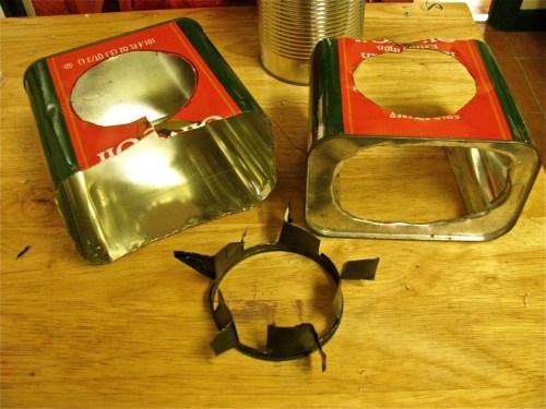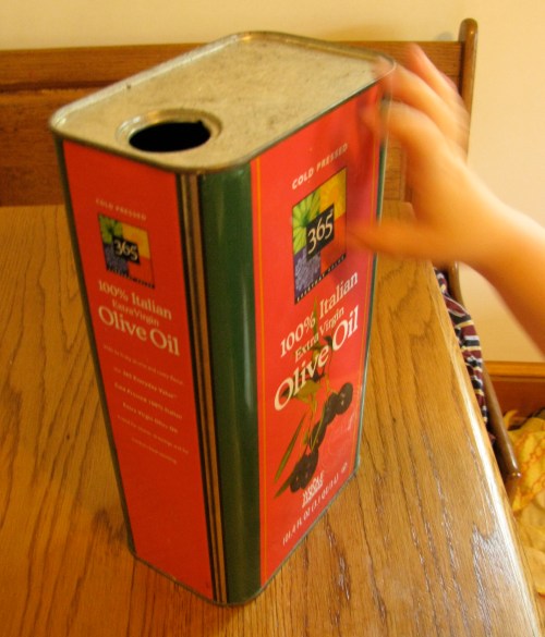 There are lots of ways to approach the stick stove, depending on what materials you’ve got around. My first one was a large size tomato can and although it worked, it was not quite big enough. I had this olive oil can saved, but when I took it out and played around with orientation I realized that it was too big. Then I got the idea to cut it in half. Perfect! Oh joy!