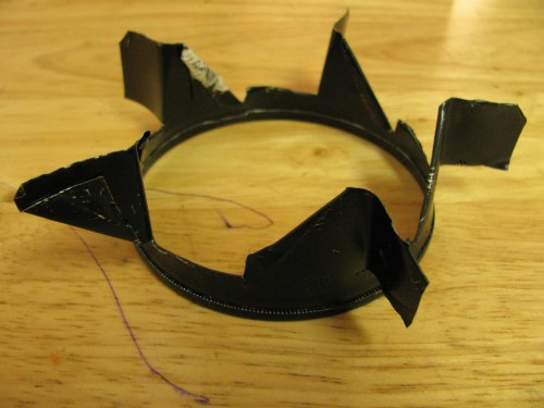 My exit hole on the first stove was inadequate. A fire without enough oxygen will never get very hot, and that’s a lot of why it took so long to boil water. This time, I had an idea to use a smaller can to create a grate on top, like on a regular stove. Something to hold the pot well up off of the stovetop, and let the hot air and smoke flow out relatively unimpeded between the tines.