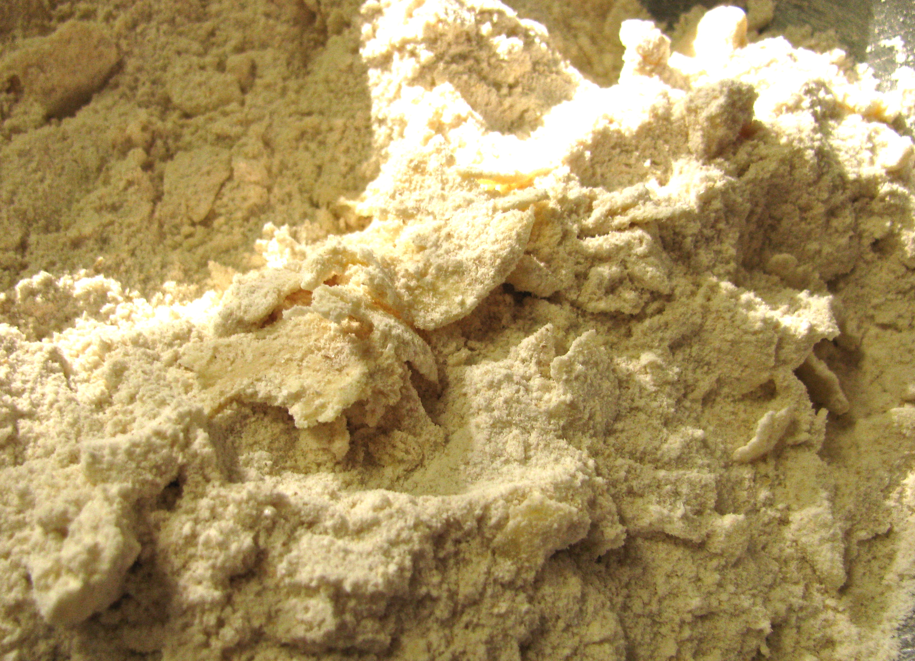 The other thing not to gloss over is the size of the butter chunks. Sure Joy of Cooking told me to leave some pieces as big as peas, but I didn’t believe them. It would look so horrifyingly irregular. I sought to tame my butter into even and homogenously tiny pieces. DON’T DO THAT!