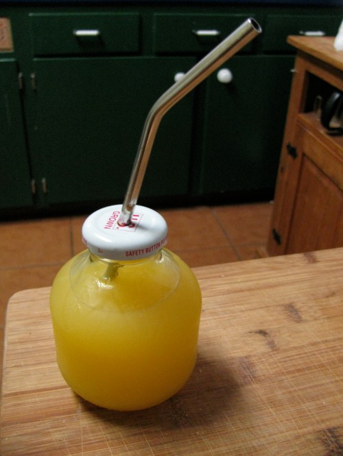 And no, these aren’t spill-proof. But then, no sippy is. Even the best ones we found (Playtex) would start leaking after the kids chewed the plastic mouthpiece enough. These apple bottles are a good shape for the sippy, partly because they’re squat– low center of gravity– but also because if they’re less than half full when they get tipped over, the level of the liquid doesn’t reach the hole, and they don’t leak at all! But even when mostly full, if you’ve been careful to make the hole perfectly fit the straw, the leaking isn’t too bad.