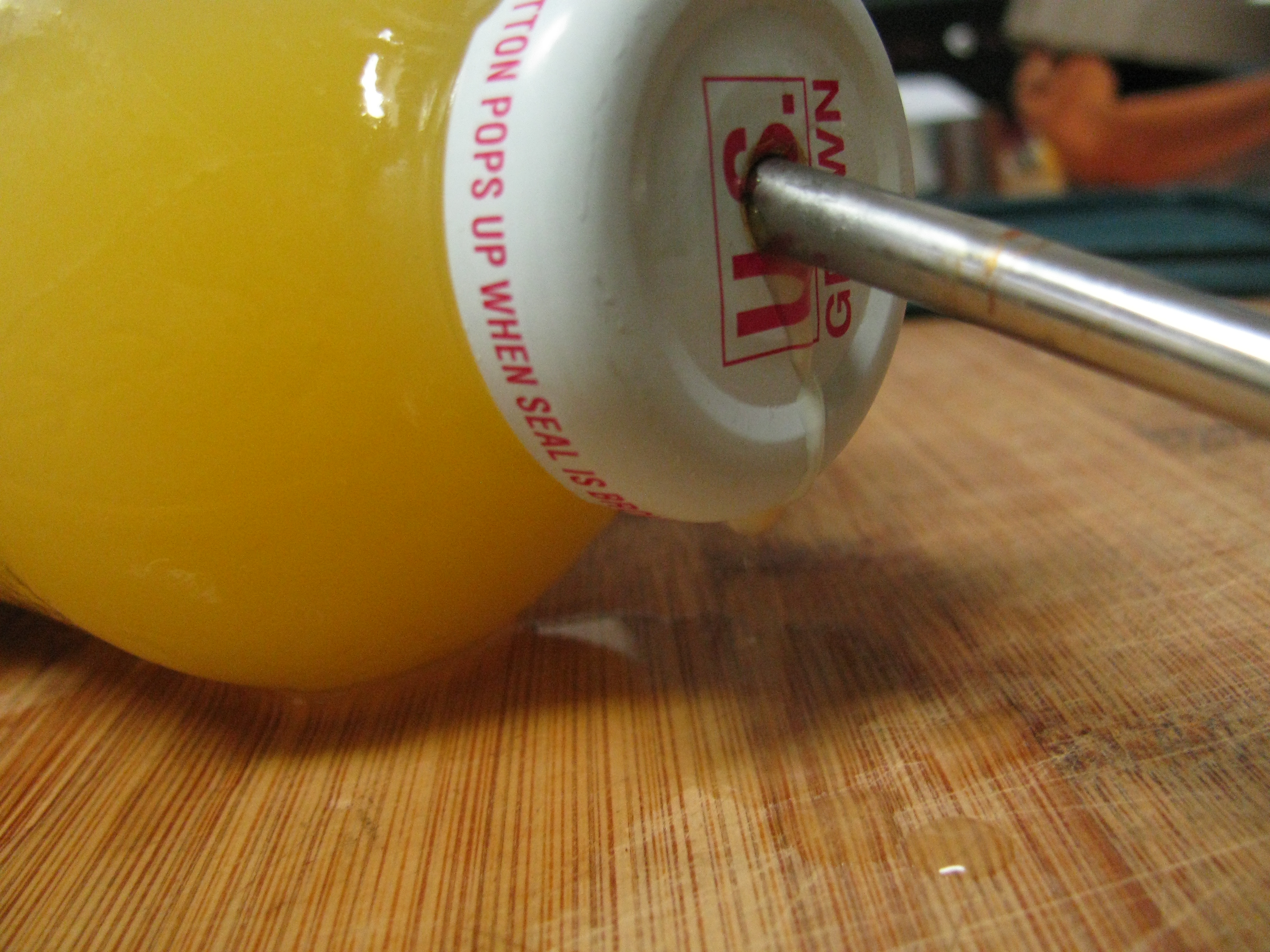 So, how to punch that sweet little hole that brings it all together. Of course drilling a hole just the size of the straw would be the logical way to do it, these lids are pretty soft metal and would be easy to drill. But my drill bit chuck is stuck tight, I can’t get the phillip’s head out to put in a drill bit. (Any advice?) So short of that I used the phillips head bit and a screw to make a hole, which wasn’t big enough, so then I used a phillips head screwdriver by hand, just yarfing it back and forth, to open the hole up enough to get the straw through. Don’t overdo it though, the tighter the hole around the straw, the less leaking action you’ll see.