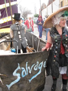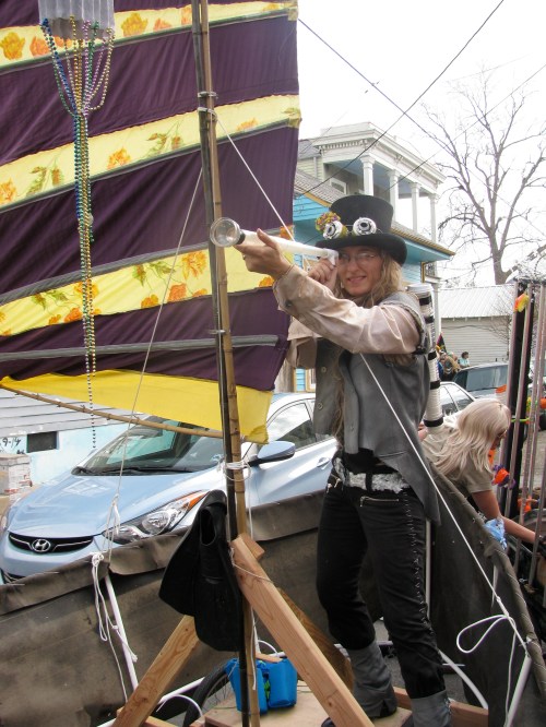 I was the navigator. I had been assembling my costume in my head for months, and then when my (much more in the know) sis arrived, she explained that what I was going for had a name– the newly stylized ‘Steam Punk.’ Apparently started at burning man and now so hot that it was all over Mardi Gras.