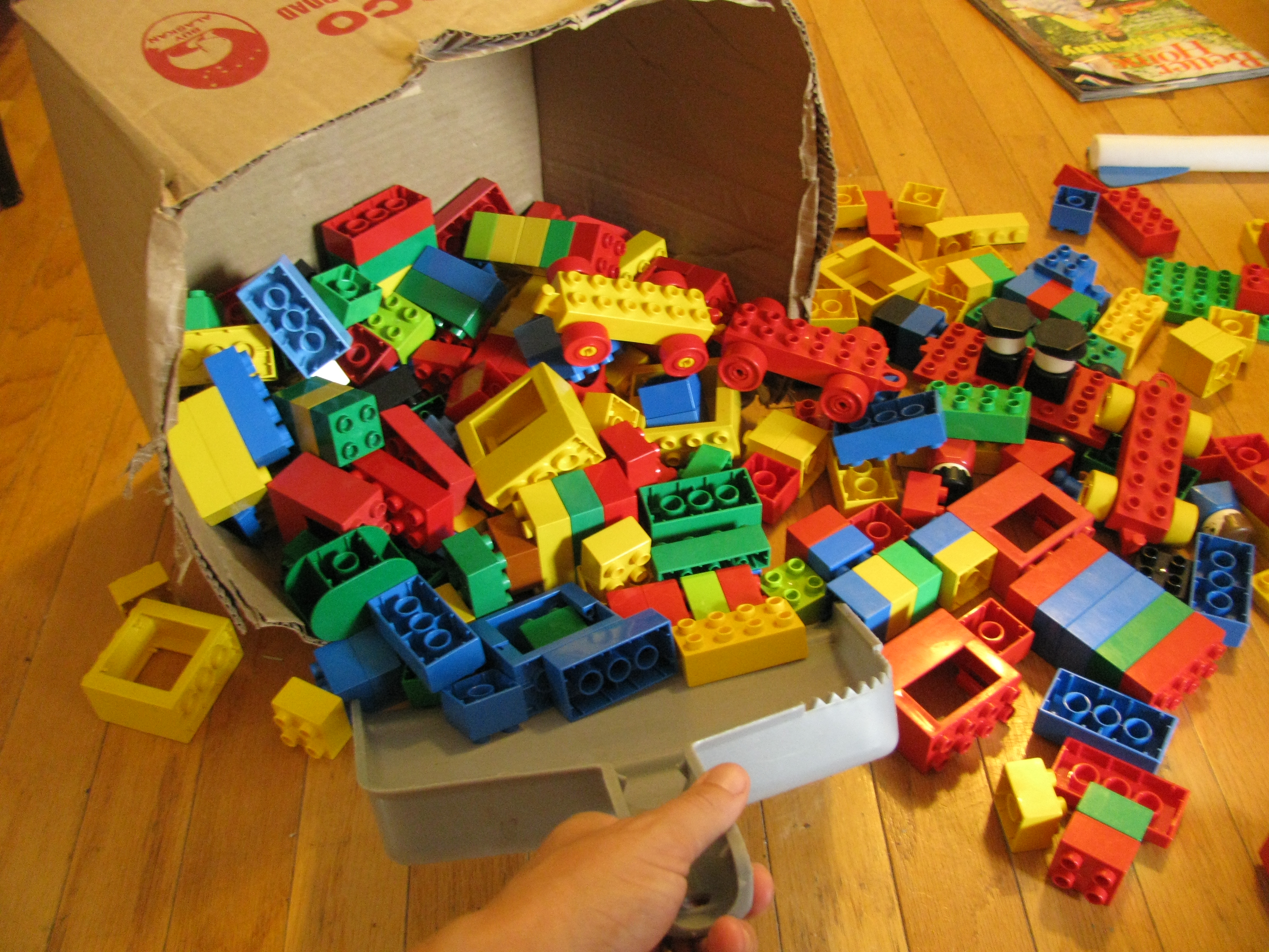 That’s when I started keeping the Leggos, and all those ‘many small pieces’ toys, up on a high shelf. The shelf is in our girl’s room, and open to view but too high for little people to reach. We take the box down once every few weeks and, miraculously, our relationship with Leggos has been remade. Not being a part of their daily landscape, the kids see them in a new light. They appreciate them more for what they were actually made for—building stuff. And I happily learned that cleaning up Leggos as soon as their play session had dissolved (don’t wait too long, a stitch in time saves nine!) is easily done with a dustpan.