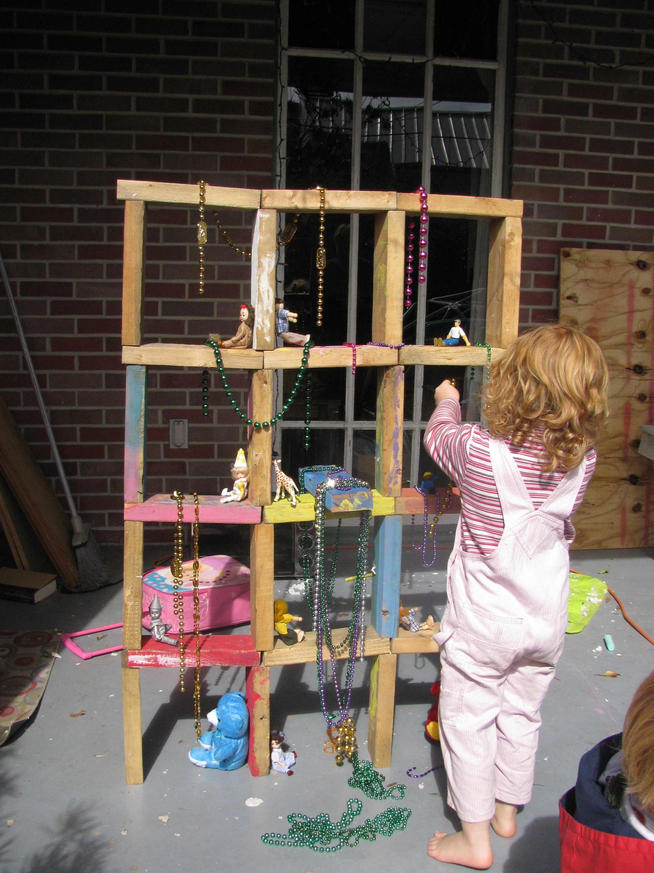 Lots of good creative toys like Leggos, Lincoln Logs, Tinker Toys, etc drive me completely insane if left accessible to the kids, though that’s the way I did it for ages. It appears that my kids’ favorite game to play with anything in the ‘many small pieces all contained in a box’ category is dumping out the box. A top favorite with Leggos in particular (they make such a great big noise!) is to then swish your hands in the pile really fast so that the pieces fly out into a completely distributed 12 foot radius. I was beginning to really hate those cheerfully colored plastic blocks. Then I finally realized that if the pieces are scattered helter-skelter across the house, they can never play with it anyway and really what’s the point?