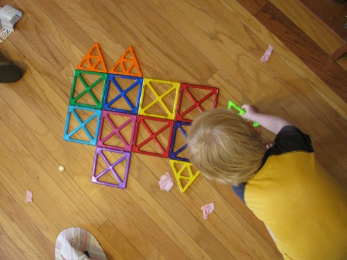 Building sets—as much as they can get on my nerves, I do like the way they work kids’ brains. Like a puzzle that you design yourself. My Man got a wonderful set of magnetic building pieces, flat squares and triangles with magnetic edges, that have become one of my favorite purchased toys of all time. Babies love them because of the satisfying way that they click together and will just hold two of them clicking together and apart for quite some time. As they get older they can use them in ever-more complex ways, starting with flat, floor based patterns and building up to awesome 3D structures. They are also easy to clean up because they click right together.