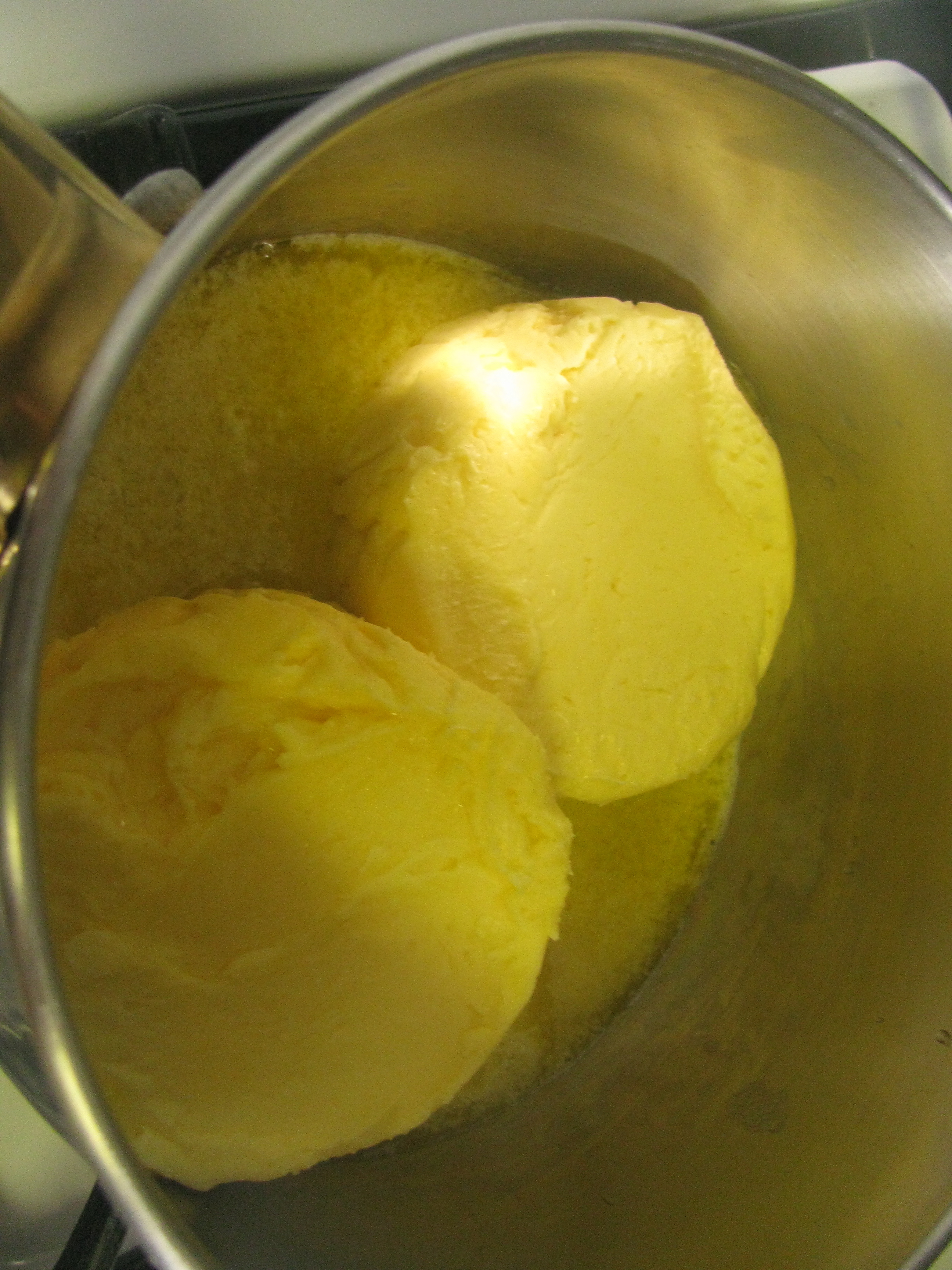 So, are you ready? Making ghee is very easy. Start by melting a pound of your farmer’s market butter over low heat.