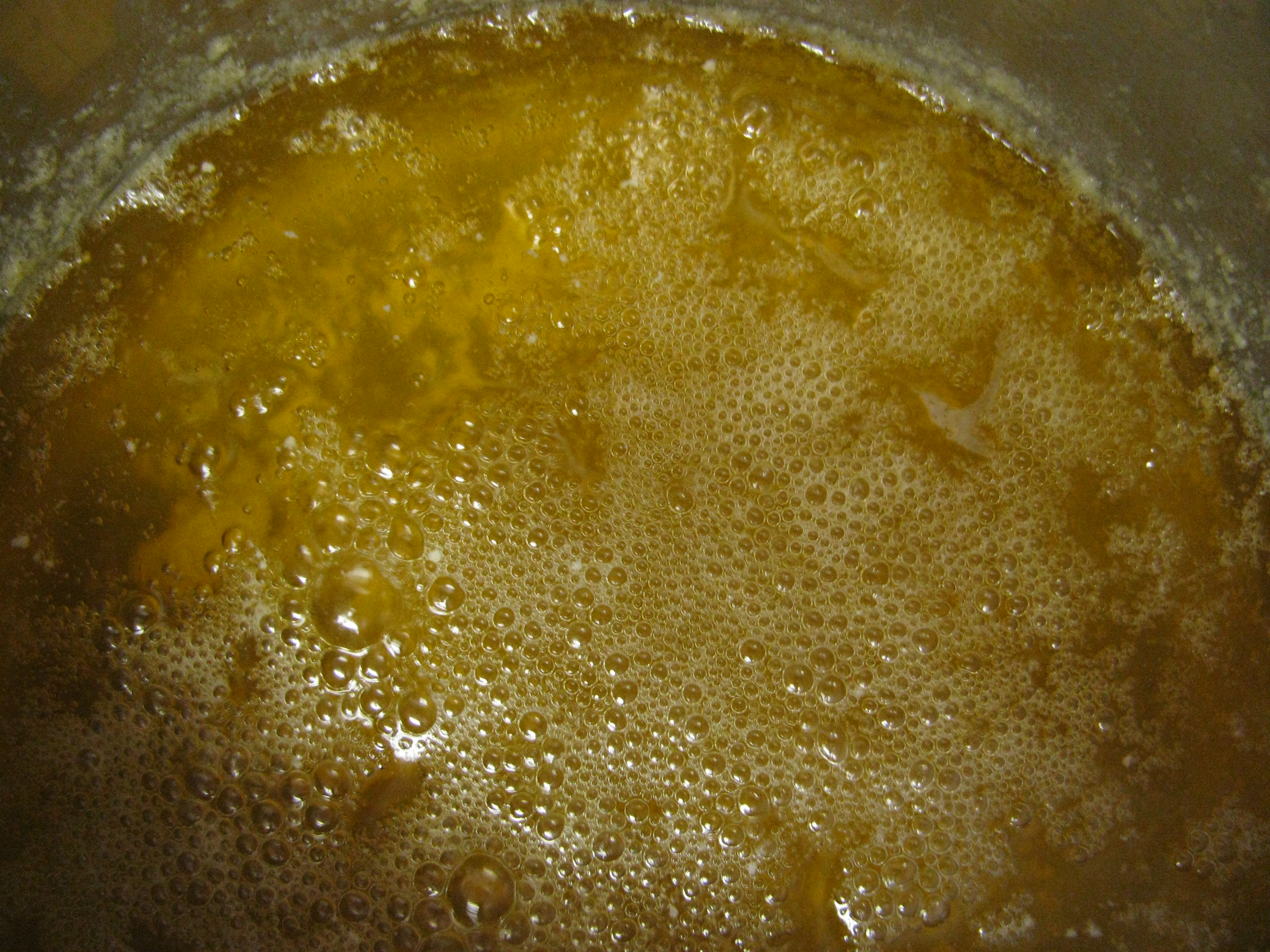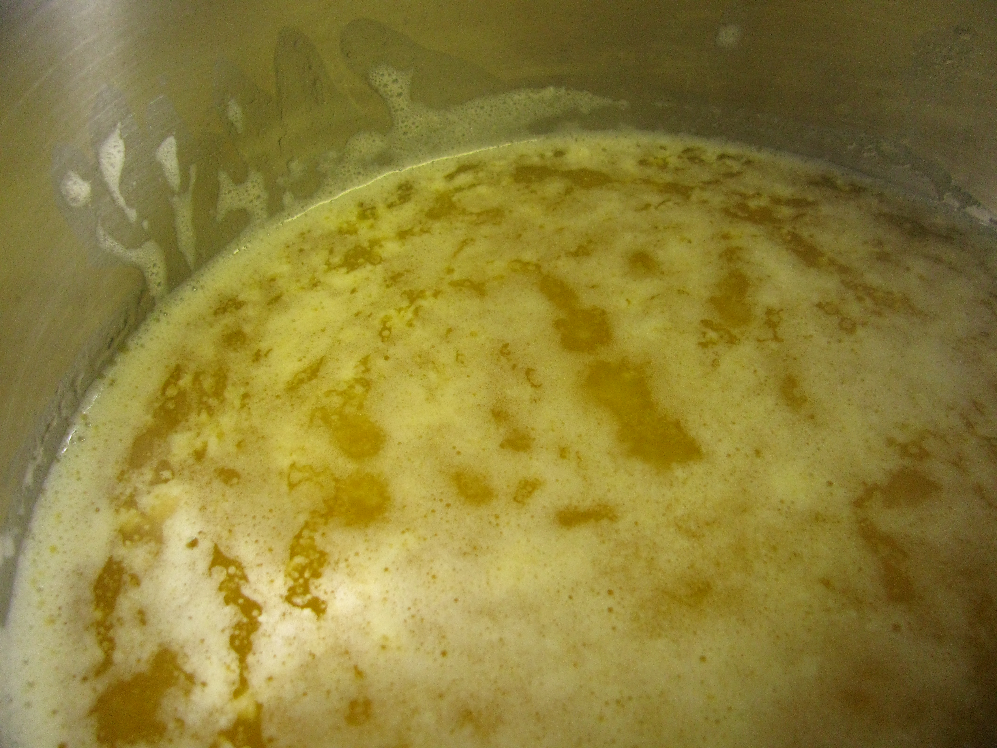 Once it’s all melted, turn the heat up to medium-low. The butter should bubble actively, but not ferociously. The foam will start to rise right away, but you only need skim it off once every 10 minutes or so. Maybe even less, I’m still experimenting. Keep a jar next to the pot for the skimmed foam.