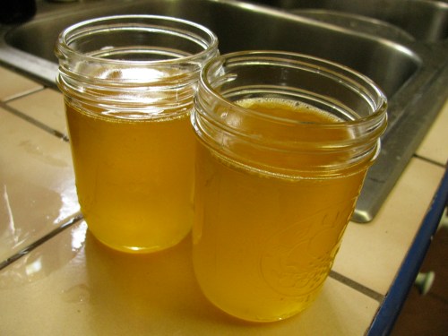 When the bubbling changes from a boiling sort of sound to a frying sort of sound, your ghee is done. If you want it to last a really long time (months) pour it through a paper towel into two half pint jars. If you only need it to last a few weeks, you can just pour it straight in so long as you are careful to keep the solids in the pot. I recommend using the more perishable foam and solids up right away for dinner rather than putting them into a jar that might get pushed to the back of the fridge and forgotten.