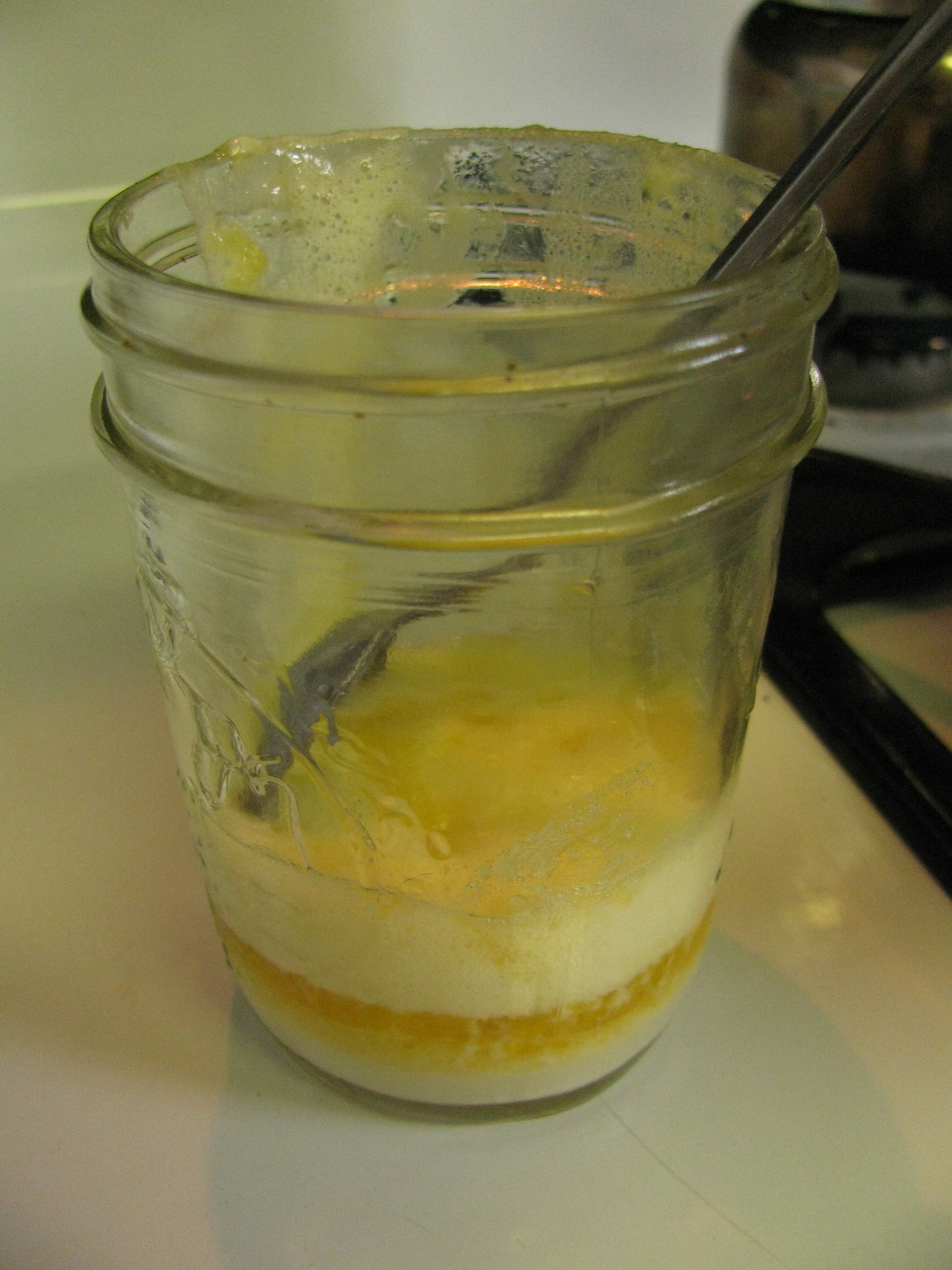 Finally the cogs met in my brain, and I made my first ever batch of ghee– the Indian name for clarified butter. Ghee is pure milk fat, with all the residual liquid boiled off and the milk solids strained out. Because it is pure fat it lasts much, much longer than plain butter and is probably the only way to keep butter at all without refrigeration in equatorial regions like India. Plain butter burns at a pretty low temperature, but ghee can get quite hot before it smokes. You still can’t leave the pan on high while you cut up the onion, but making pancakes is a dramatically less smoky experience.