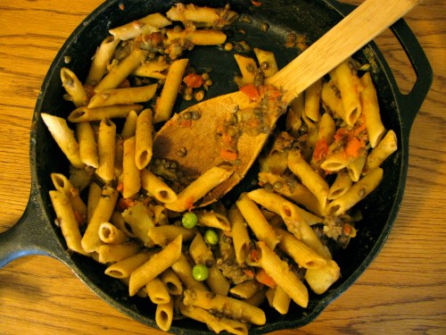 Last night’s incarnation involved leftover penne mixed with leftover lentil soup thawed from frozen two days ago (complete with potatoes and carrots) mixed with one leftover hamburger patty, crumbled up. Sounding crazy? Wait, there’s more! The soup was very thick, so I added a puck of frozen chopped tomatoes and a healthy glug of olive oil to the skillet. I had a small handful of peas from the garden too. I heated it all up over high heat so that the pasta got that little bit of a fried texture and all the flavors thoroughly infused.