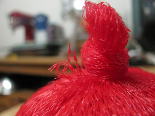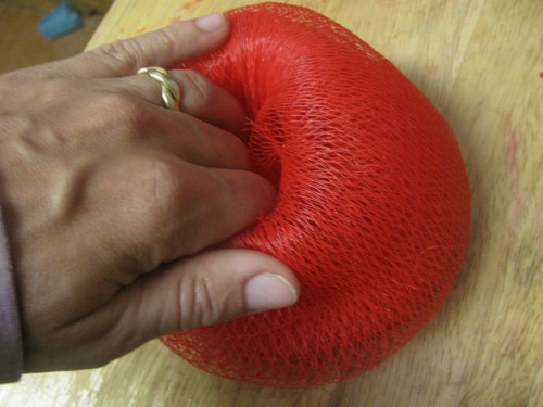 Step 4: Reserve you longest, nubbiest one for the last. Instead of rolling it in like the others, tie a knot in one end to reform the bag, turn it inside out (so the knot is on the inside bottom of the bag) then insert your sausage roll. Work the knot up into the center of the roll. Scrunch the wad up inside the bag until it feels like a good scrubbie size and density, then tie up the top of the bag, fold the top back under and tie again so that your outside bag is wrapped twice around the whole shebang. Tie again, but this time attempt to not pull the end all the way through the knot so that the scratchy ends are not pointing up into your hand.
